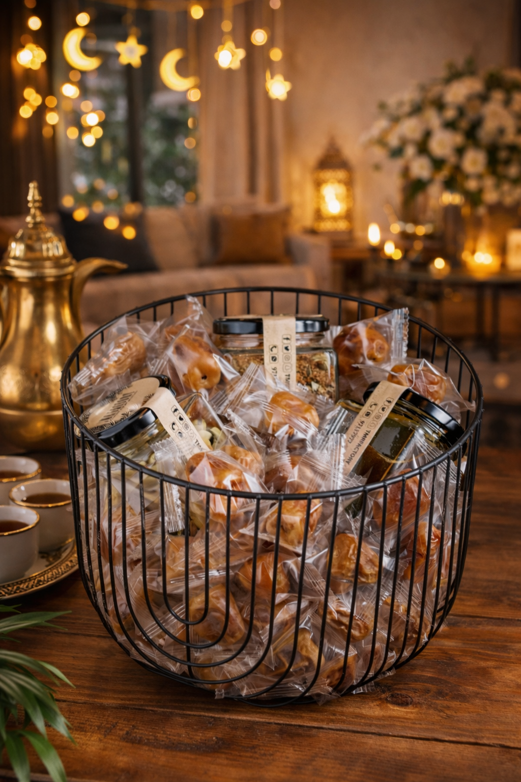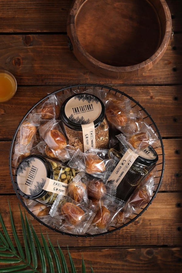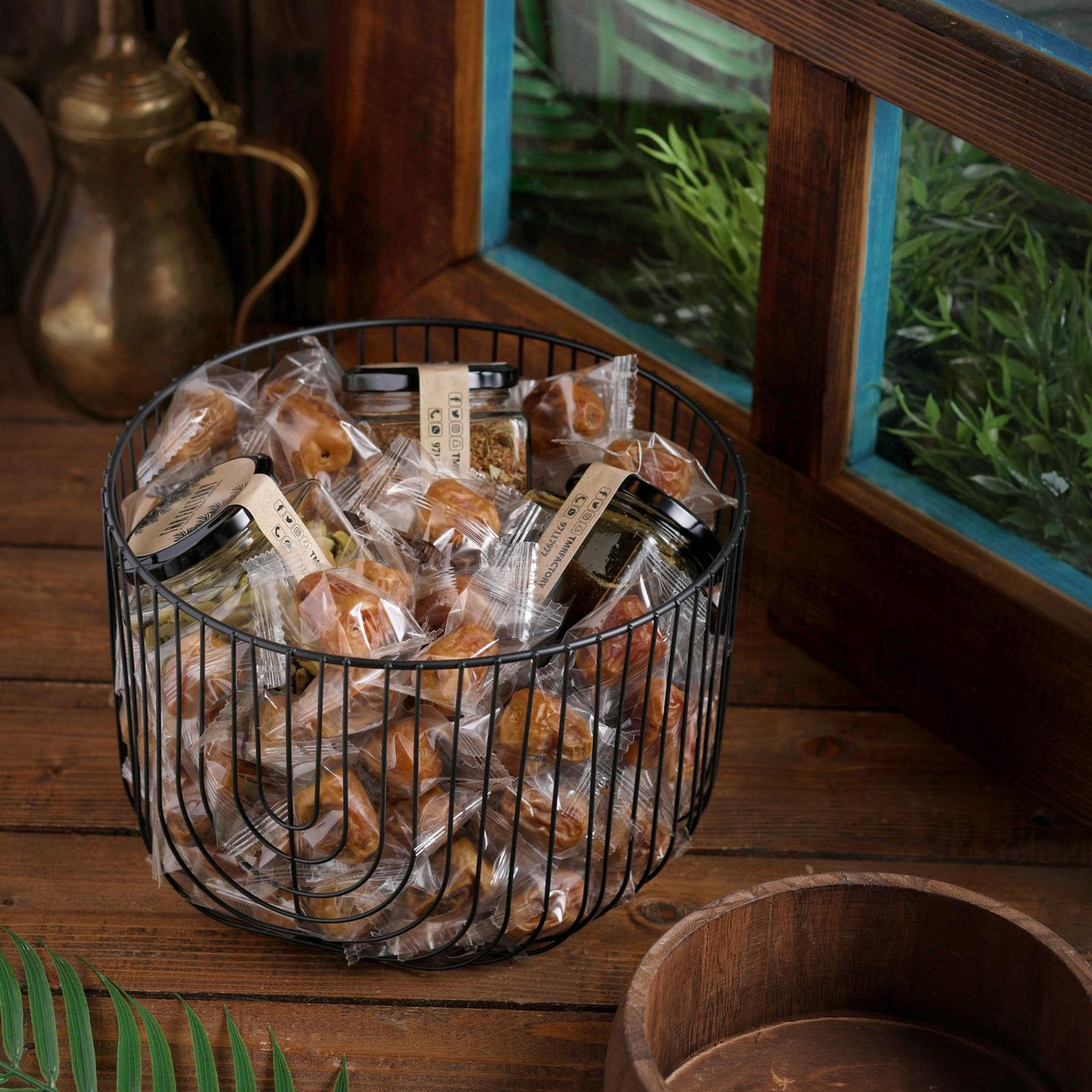 Neqsa contains a kilo and a half of wrapped sukary dates served with Arabic coffee, cardamom and natural date molasses. size : 25x25x16 cm