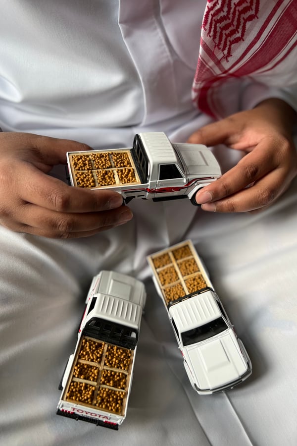A small model of the famous dates sellers car at the Qassim Dates Festival . Size 13 X 6